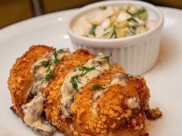Peito de frango recheado com manteiga de ervas e cogumelos, super crocante e suculento ao mesmo tempo. Acompanha salada Olivier uma maionese super crocante com pepino, vagem, batata, presunto...